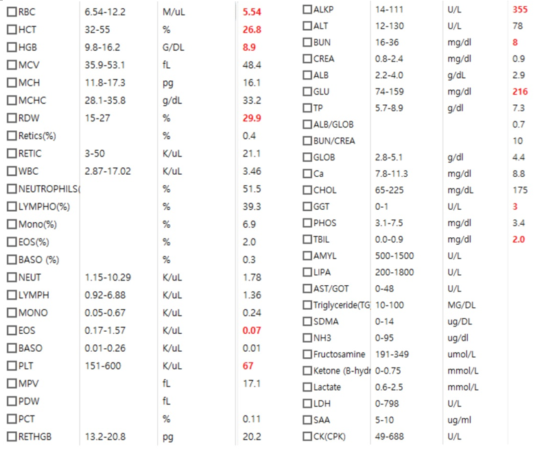 피검사를 해보니 가벼운 빈혈과 함께 ALKP, GGT, 총빌리루빈 등 간 수치들이 꽤 높게 올라가 있었습니다. 이어서 간과 주변 장기들의 상태를 눈으로 직접 확인하기 위해 초음파 검사를 꼼꼼히 진행했습니다.