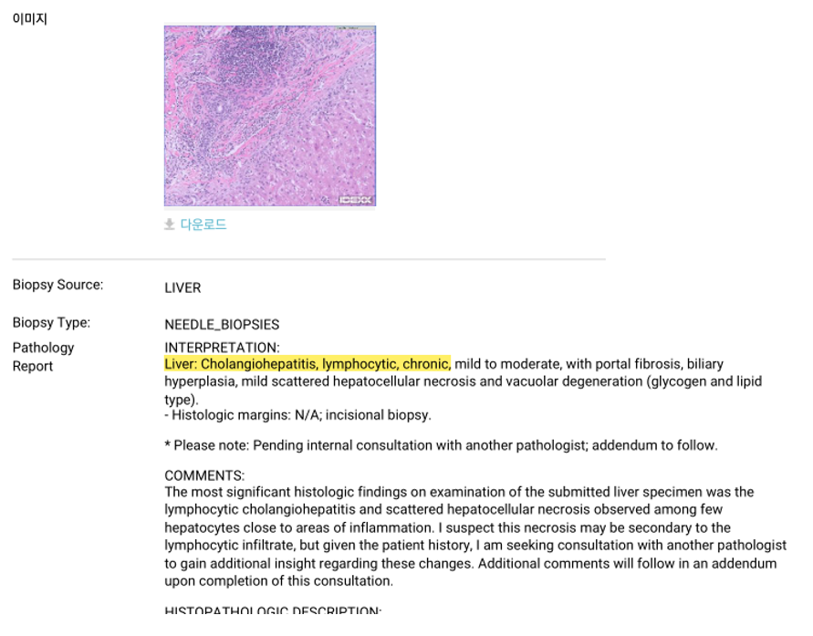 결과지에 적힌 진단명은 '만성 림프구성 담관간염 (Cholangiohepatitis, lymphocytic, chronic)'.